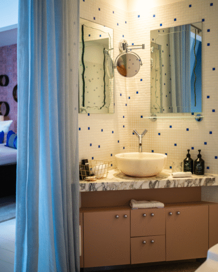 Relax and rediscover your inner peace amidst sophisticated blue and pink accents, and let your senses fill with luxury and comfort.